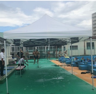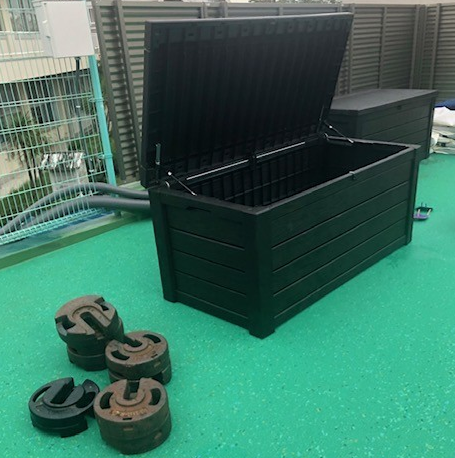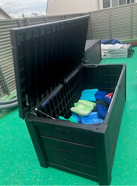 これに伴いプールサイドに日除け及び収納スペースの確保のため、以下の物品を寄贈しました。